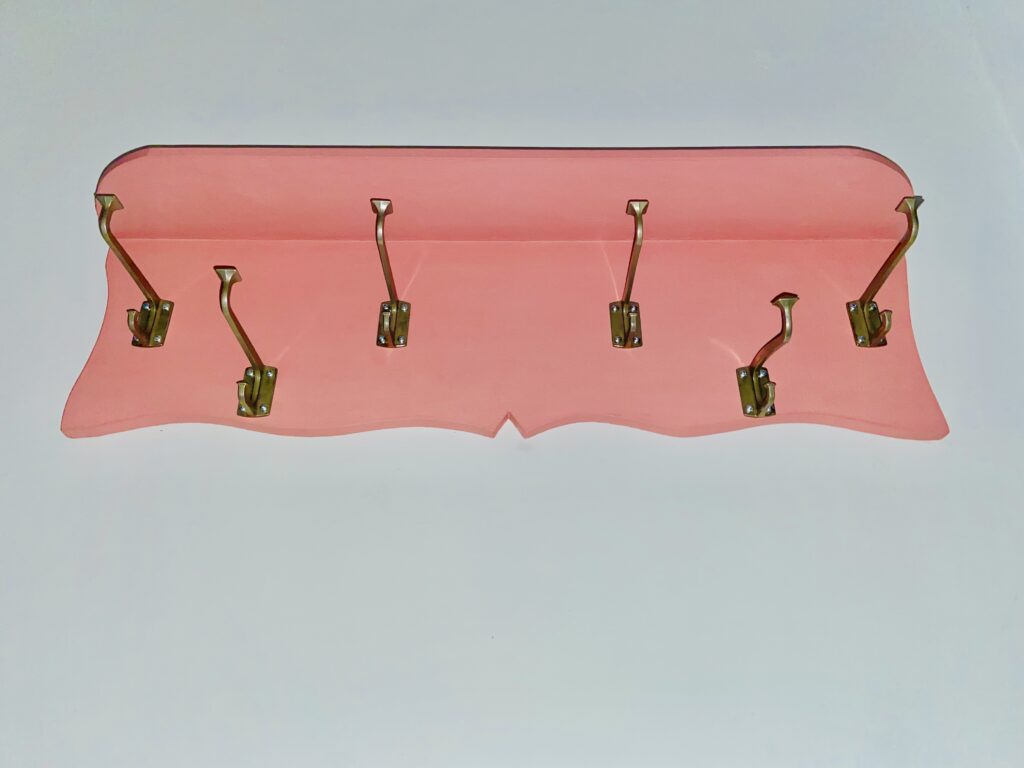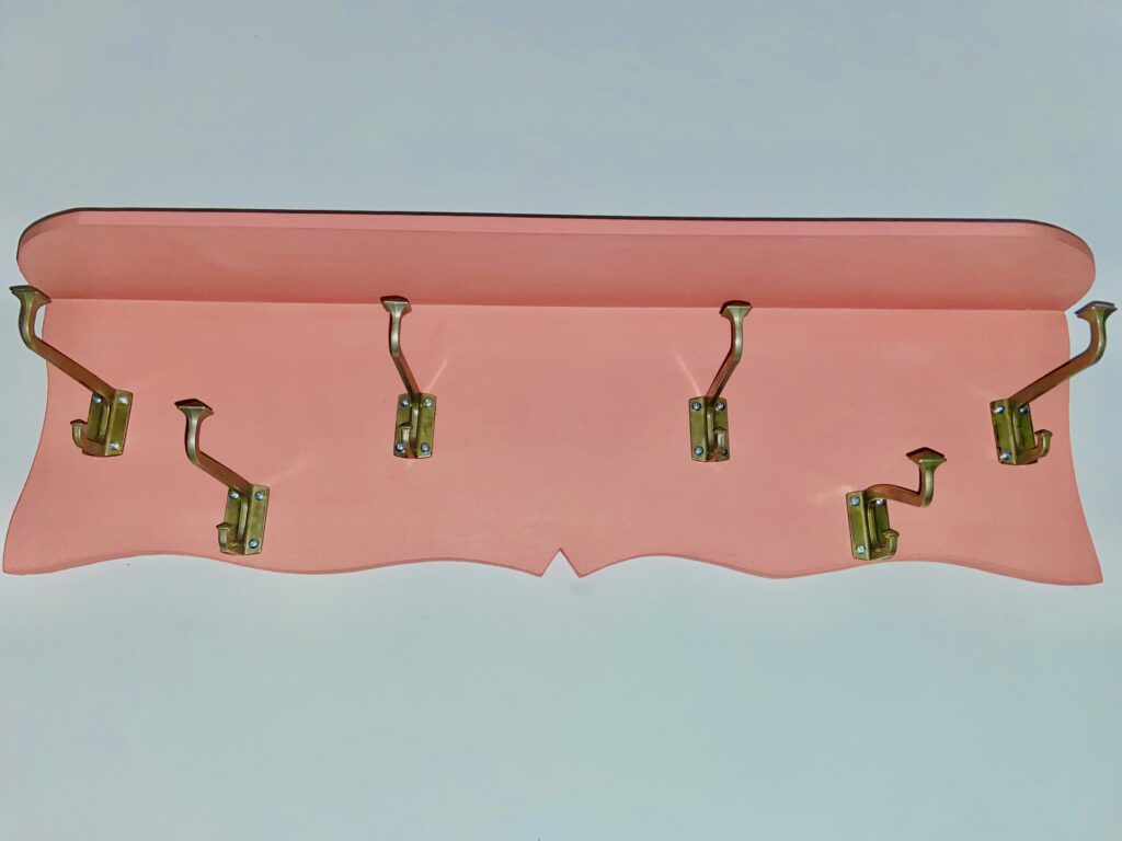 Leuke vintage roze kapstok met 6 stevige haken en een ruime hoedenplank bovenaan.
